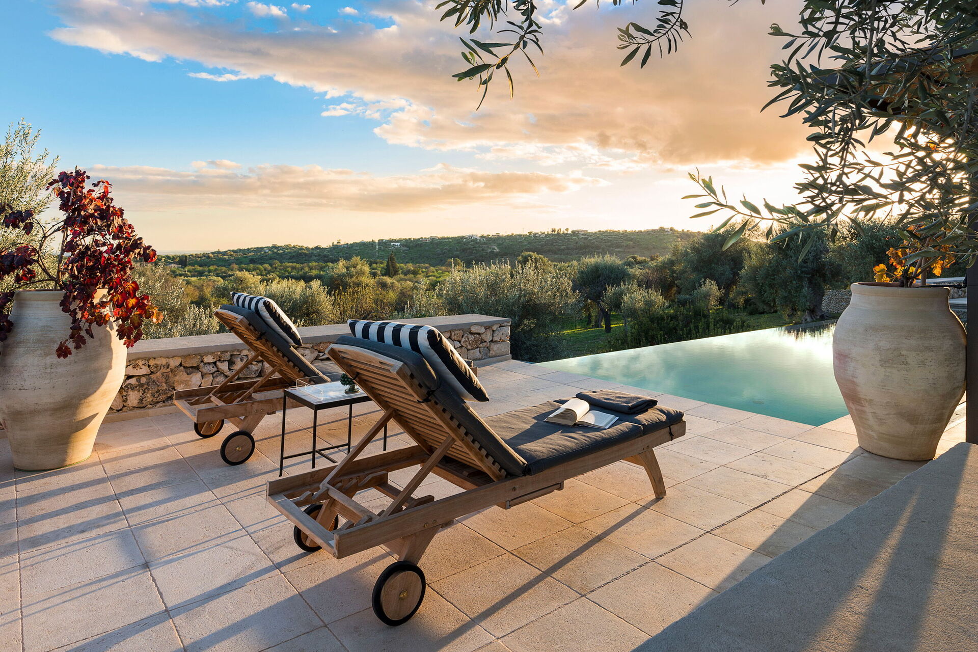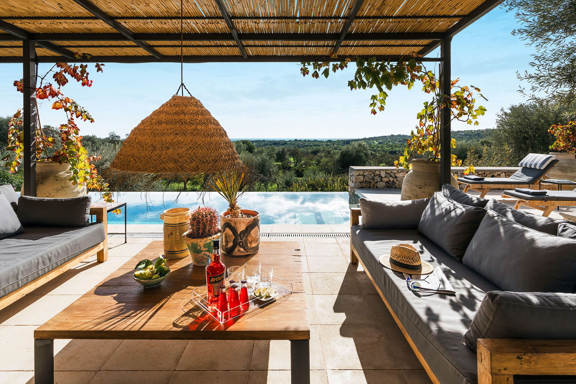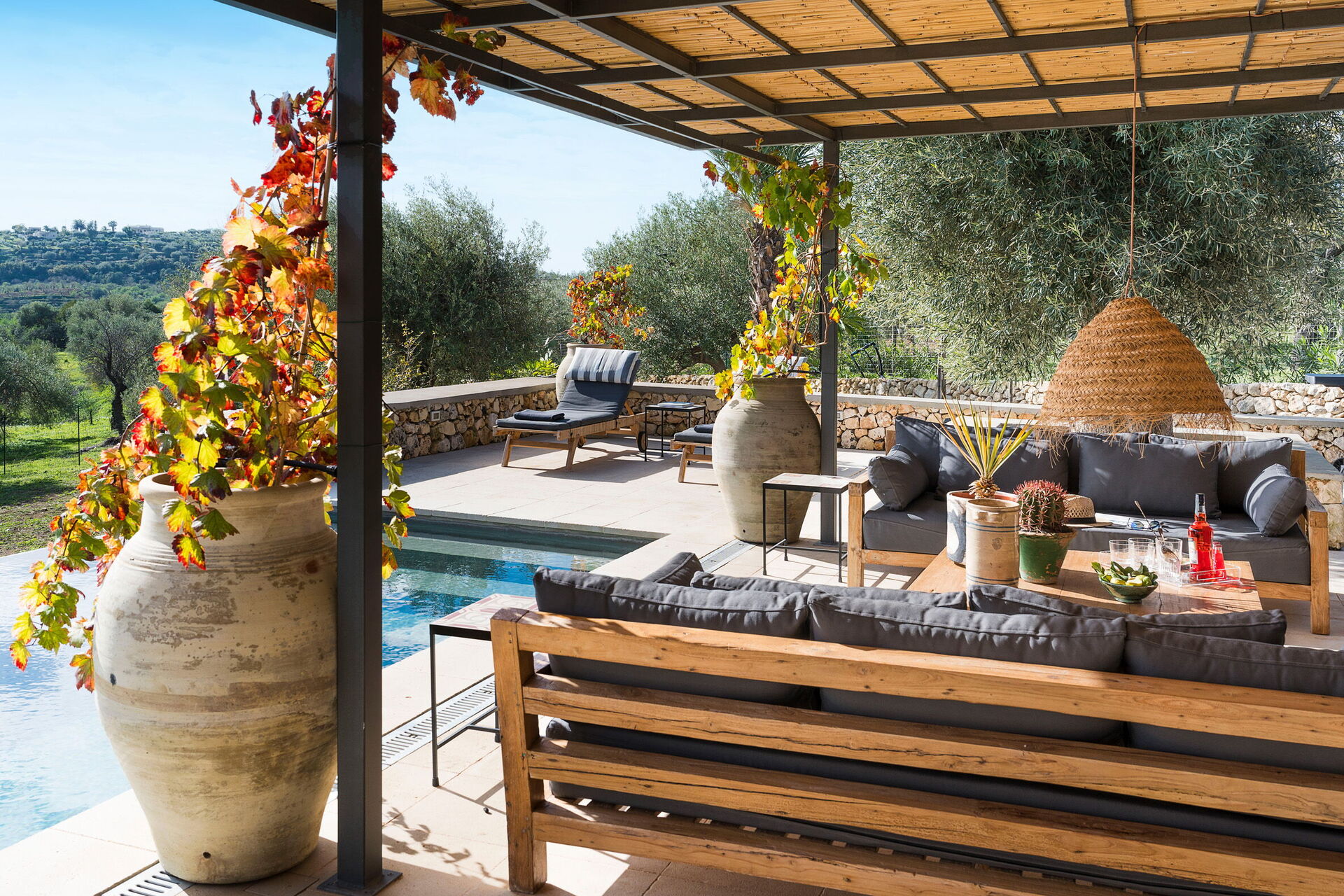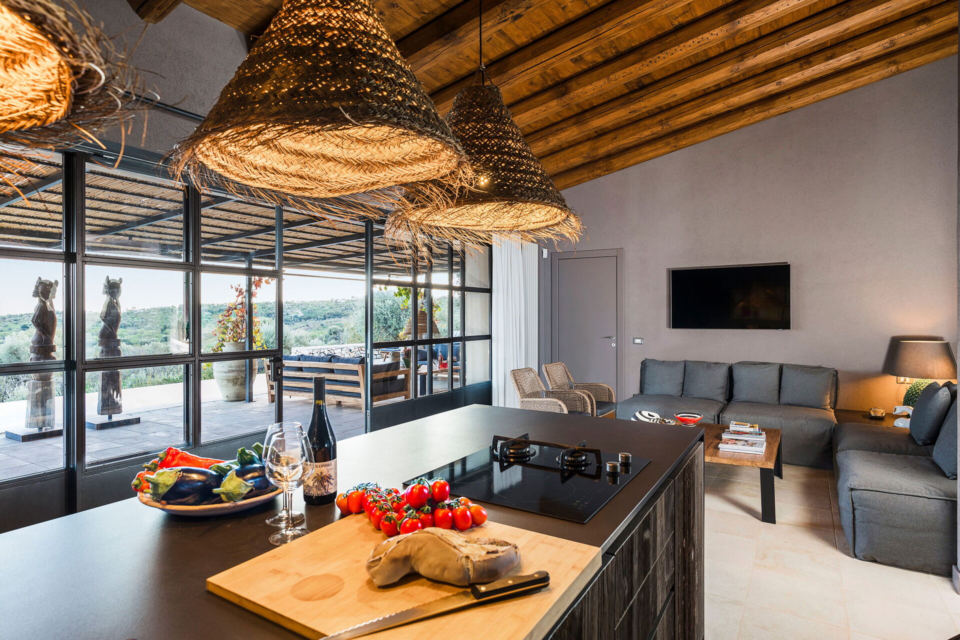 Huset ligger i en naturpark omgiven av olivträd och erbjuder panoramautsikt över det sicilianska landskapet och havet.