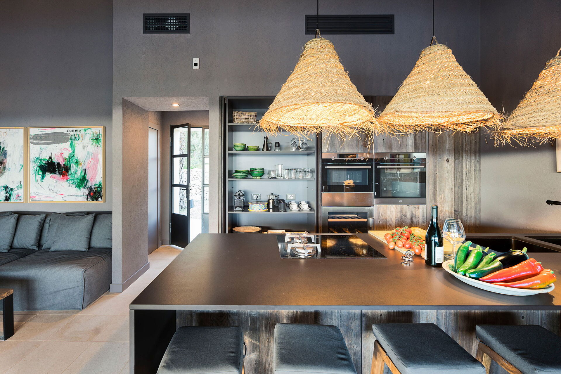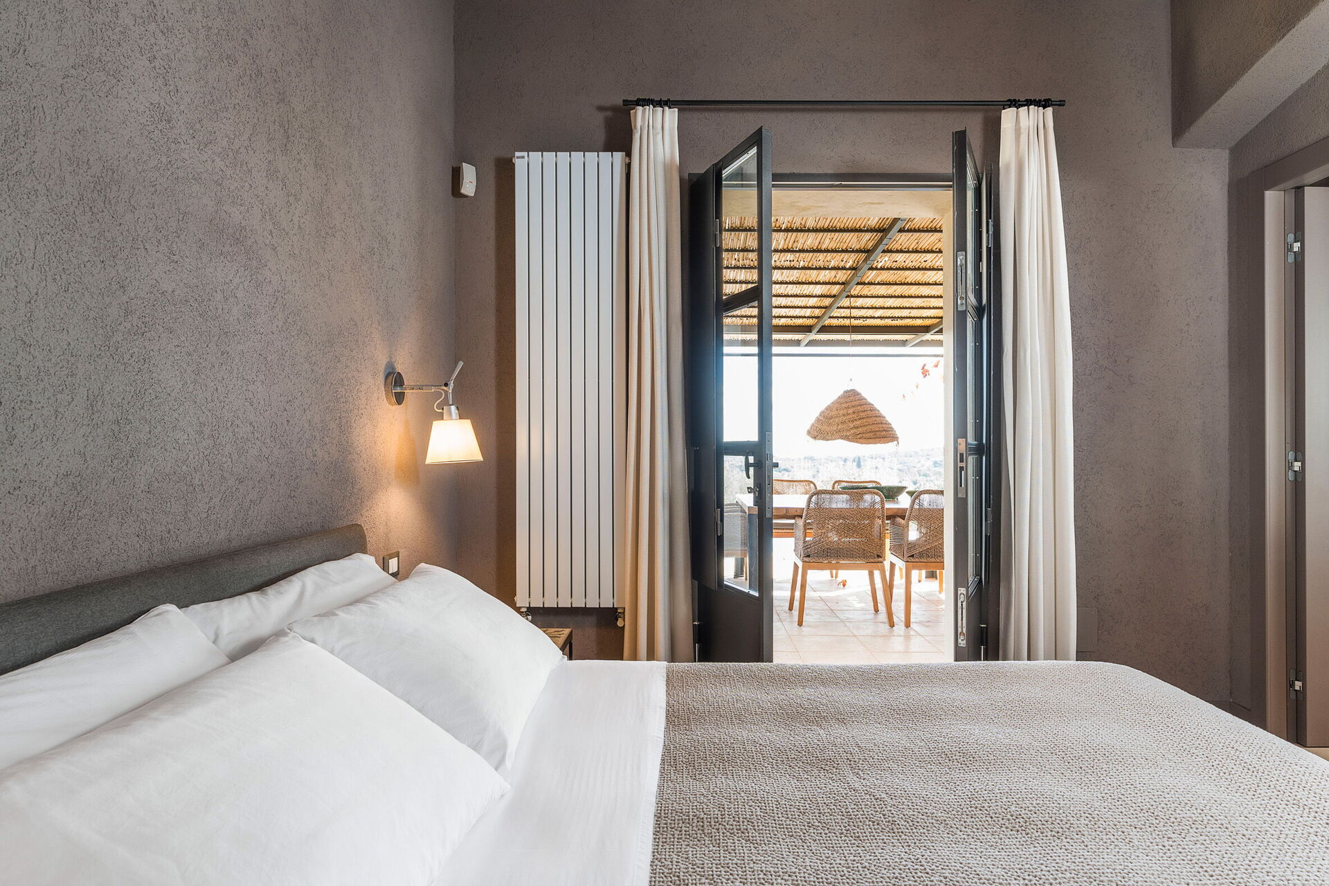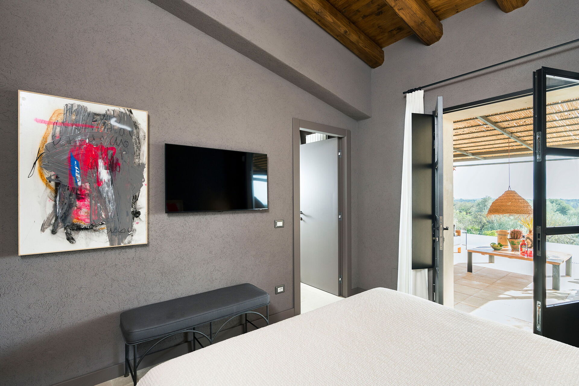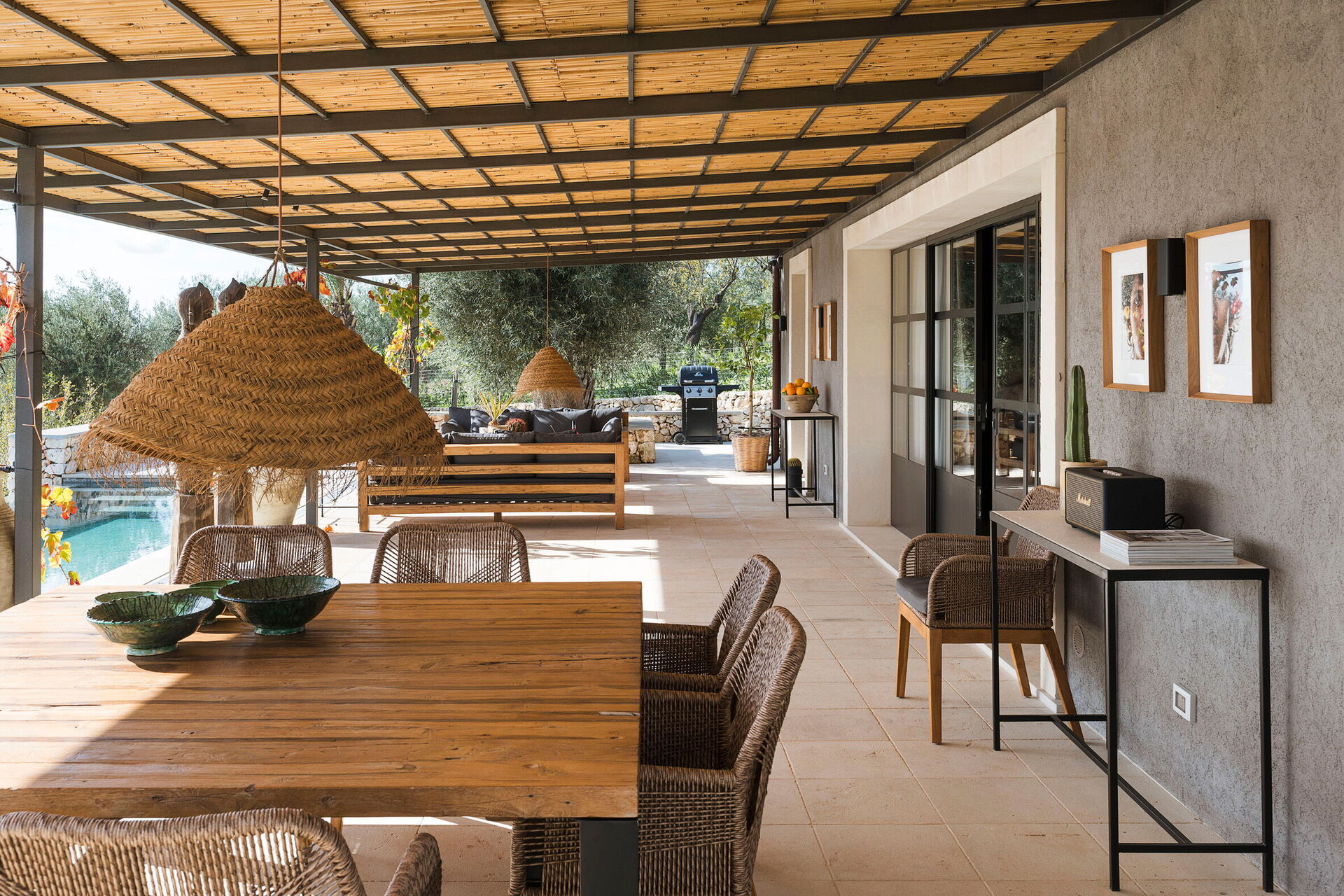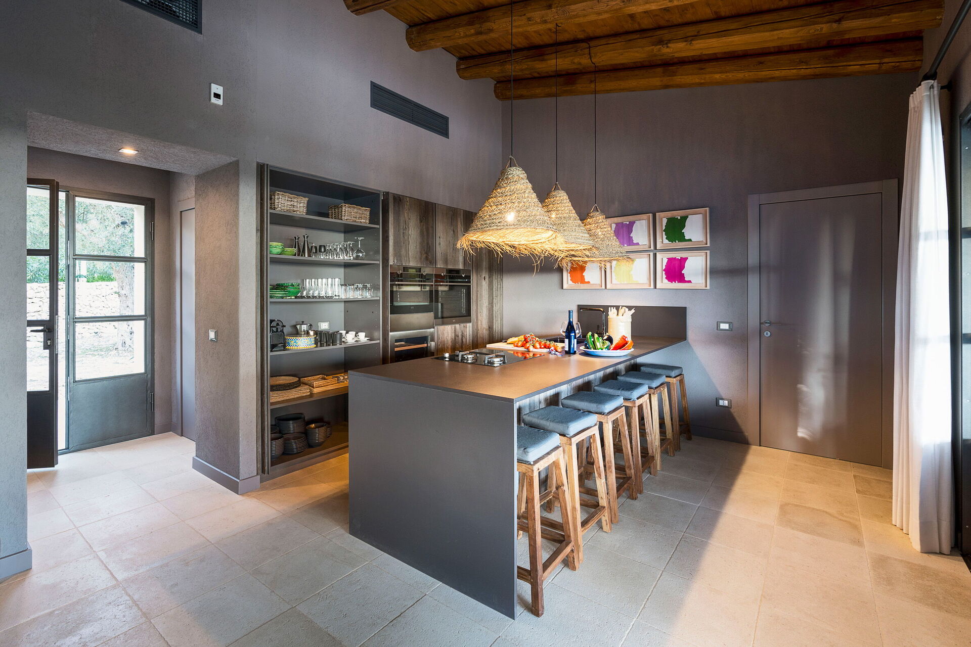 Huset ligger i en naturpark omgiven av olivträd och erbjuder panoramautsikt över det sicilianska landskapet och havet.